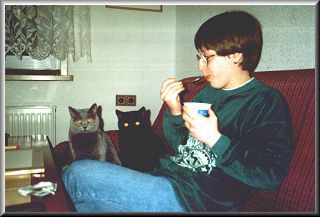 Hallo, wir sind aus dem Hause der Britisch Kurzhaar und wurden am 30. März 1995 in Kassel (nahe der Karlsaue, wie unser Zwinger-Name schon erahnen läßt) geboren. Wir waren fünf Geschwister, zwei graue und drei schwarze.